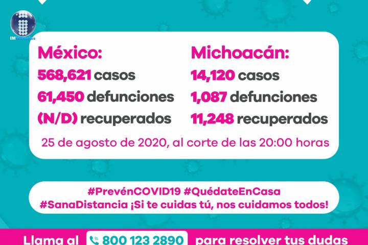 NOTICIAS 25/08/2020Ya son 1087 muertes por Covid-19 en Michoacán En la Unidad de Inteligencia Epidemiológica y Sanitaria (UIES), se han recibido un total de 37 mil 182 notificaciones de enfermos de vías respiratorias a descartar coronavirus, 21 mil 102 cumplieron con definición operacional resultando negativas a COVID-19, es decir, no tienen el virus.
