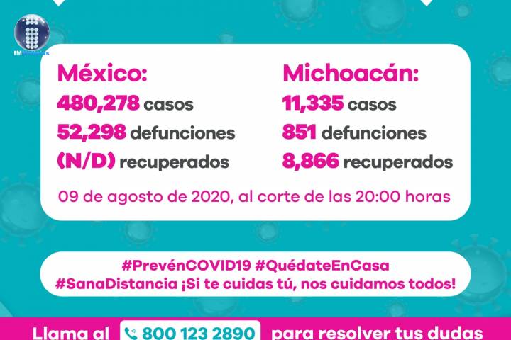 NOTICIAS 09/08/2020Michoacán, con 851 defunciones por COVID-19En la Unidad de Inteligencia Epidemiológica y Sanitaria (UIES), se han recibido un total de 31 mil 603 notificaciones de enfermos de vías respiratorias a descartar coronavirus, 18 mil 127 cumplieron con definición operacional resultando negativas a COVID-19, es decir, no tienen el virus.