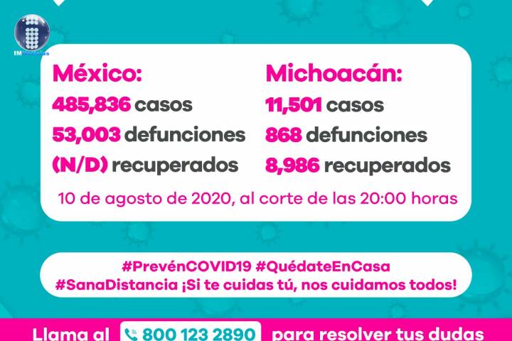 NOTICIAS 11/08/2020884 defunciones por COVID-19 en MichoacánEn la Unidad de Inteligencia Epidemiológica y Sanitaria (UIES), se han recibido un total de 32 mil 246 notificaciones de enfermos de vías respiratorias a descartar coronavirus, 18 mil 450 cumplieron con definición operacional resultando negativas a COVID-19, es decir, no tienen el virus.