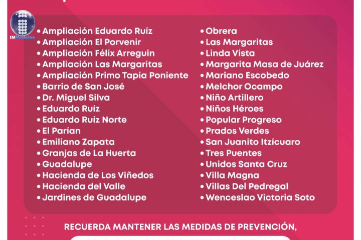 Las colonias afectadas son, Ampliación Eduardo Ruíz; Granjas de La Huerta; Niño Artillero; Ampliación El Porvenir; Guadalupe; Niño... Ver más...