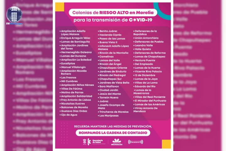 NOTICIAS 11/08/2020Registra Morelia, 63 colonias con riesgo alto de contagio por COVID-19La Secretaría de Salud de Michoacán (SSM), hace un llamado a la población de las 63 colonias de Morelia que se encuentran en riesgo alto de contagio de COVID-19, a extremar las medidas preventivas y de ser posible, quedarse en casa.