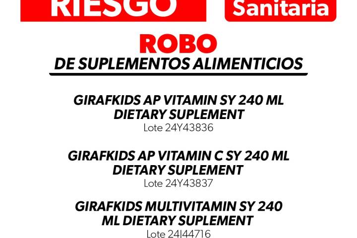 NOTICIAS 07/04/2025Alerta SSM sobre robo y riesgo sanitario de suplementos alimenticiosLa Comisión Federal para la Protección contra Riesgos Sanitarios (Cofepris) a través de la Secretaría de Salud de Michoacán (SSM) informa a la población en general sobre el robo de suplementos alimenticios pertenecientes a la empresa BIOFARMA NATURAL CMD, S.A. DE C.V., ocurrido durante el traslado de los productos.