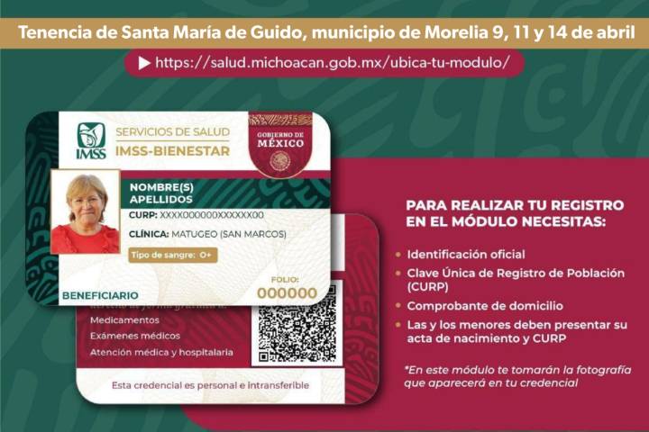 NOTICIAS 08/04/2025Credencialízate con IMSS Bienestar y obtén consultas y medicamentos gratuitosLa Secretaría de Salud (SSM) en coordinación con el IMSS Bienestar informan a la población de la Tenencia de Santa María de Guido, municipio de Morelia sobre la realización de la Jornada de Credencialización que se llevará a cabo en la plaza principal de la localidad.