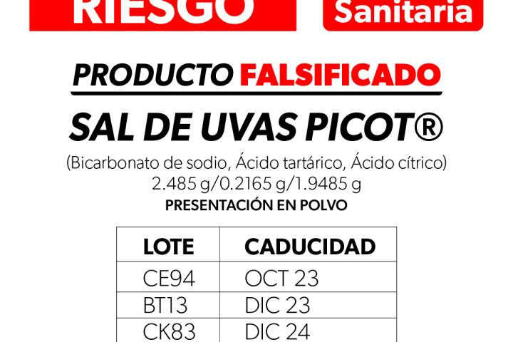 NOTICIAS 11/04/2025Alerta SSM sobre la falsificación del producto Sal de Uvas PicotLa Comisión Federal para la Protección contra Riesgos Sanitarios (Cofepris), a través de la Secretaría de Salud de Michoacán (SSM) informa a la población que se ha identificado la falsificación del producto Sal de Uvas Picot® (Bicarbonato de sodio, Ácido tartárico, Ácido cítrico) en polvo, en presentación de 2.485 g/0.2165 g/1.9485 g.