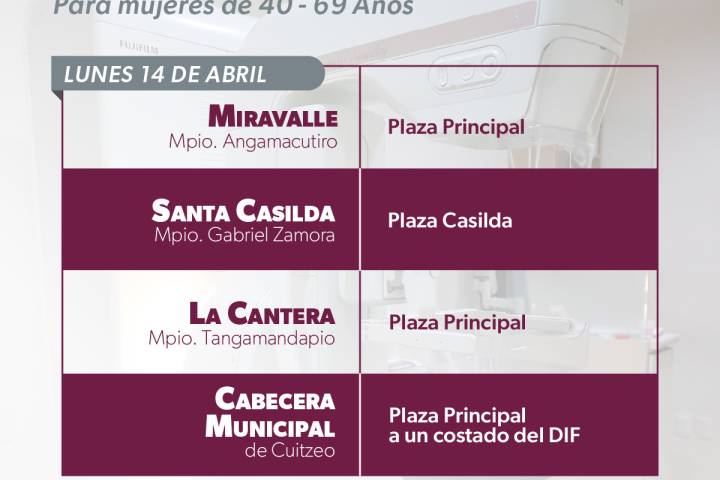 Es así, que del 14 al 16 de abril las unidades serán instaladas en Angamacutiro, Gabriel Zamora, Tangamandapio, Cuitzeo, Penjamillo y Nuevo Parangaricutiro con un horario de atención de 9:00 a 18:00 horas con servicio totalmente gratuito.