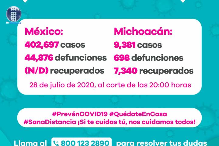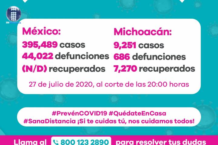 NOTICIAS 28/07/2020698 defunciones en Michoacán por COVID-19En la Unidad de Inteligencia Epidemiológica y Sanitaria (UIES), se han recibido un total de 27 mil 285 notificaciones de enfermos de vías respiratorias a descartar coronavirus, 15 mil 624 cumplieron con definición operacional resultando negativas a COVID-19, es decir, no tienen el virus.