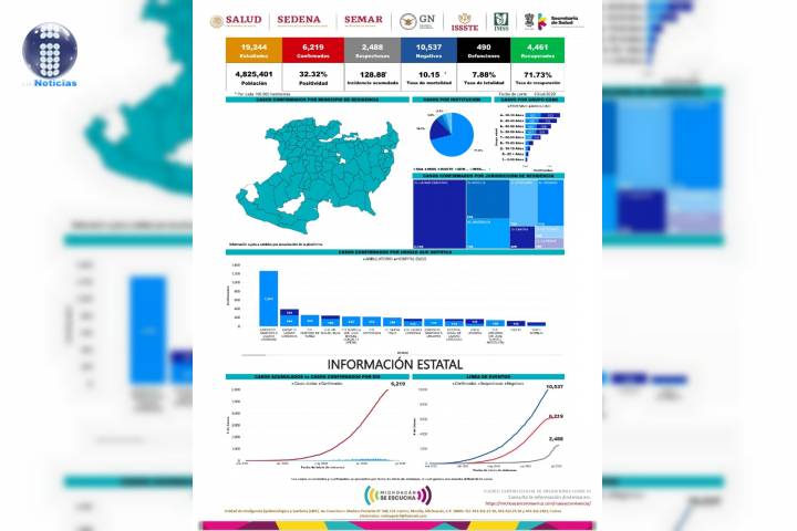 NOTICIAS 05/07/2020Acumula Michoacán 497 defunciones por COVID-19 En la UIES ESTATAL, se han recibido un total de 19 mil 500 notificaciones de enfermos de vÃas respiratorias a descartar coronavirus, 10 mil 876 cumplieron con definición operacional resultando negativas a COVID-19, es decir, no tienen el virus.
