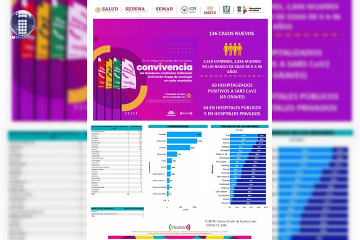 Hasta el dÃa de hoy se han acumulado 6 mil 355 casos confirmados (136 casos nuevos) y 493 defunciones de pacientes po... Ver más...