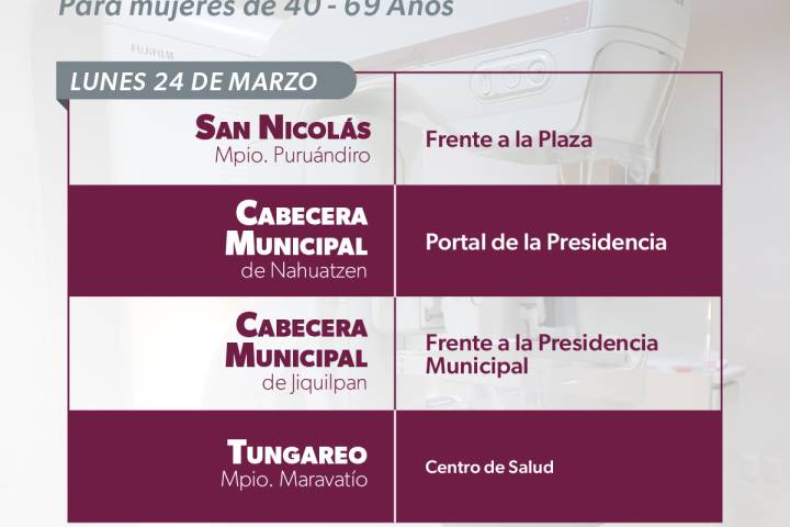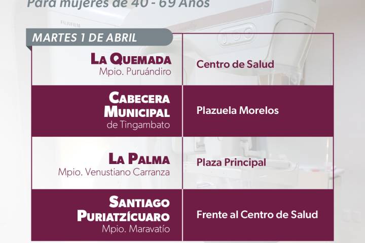 En las cabeceras municipales de Puruándiro, Nahuatzen, Venustiano Carranza, Maravatío, Villa Morelos, Villamar, Ziracuaretiro y Tingambato, las mujeres de 40 a 69 años podrán realizarse sin costo el estudio de mama.