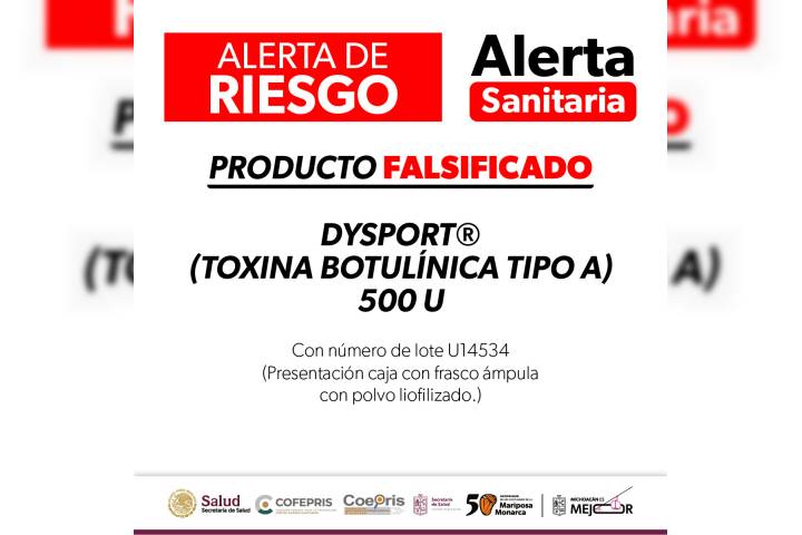 NOTICIAS 25/03/2025Alerta SSM sobre la falsificación del medicamento DysportLa Comisión Federal para la Protección contra Riesgos Sanitarios (Cofepris) a través de la Secretaría de Salud de Michoacán (SSM), alerta a la población sobre la presencia de productos falsificados y adulterados del medicamento DYSPORT® (Toxina botulínica tipo A) 500 U, que representan un riesgo para la salud.