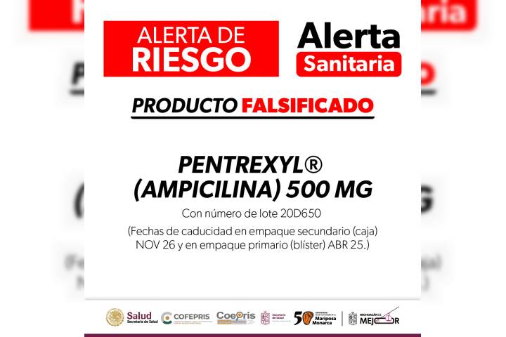 NOTICIAS 27/03/2025Alerta SSM sobre falsificación del medicamento Pentrexyl La Comisión Federal para la Protección contra Riesgos Sanitarios (Cofepris) a través de la Secretaría de Salud de Michoacán (SSM) informa a la población y profesionales de la salud sobre la detección de Pentrexyl® (ampicilina) 500 mg falsificado, identificado con el número de lote 20D650 y fechas de caducidad en empaque secundario (caja) NOV 26 y en empaque primario (blíster) ABR 25.