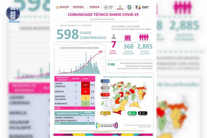 NOTICIAS 10/05/2020598 casos confirmados y 70 defunciones por COVID-19 en Michoacán