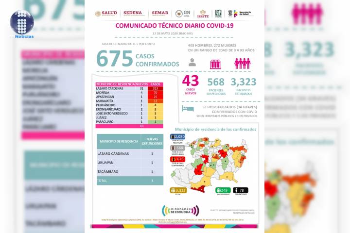NOTICIAS 12/05/2020En Michoacán, 675 casos y 78 defunciones por COVID-19En la UIES ESTATAL, se han recibido un total de 3 mil 323 notificaciones de enfermos de vÃas respiratorias, a descartar coronavirus, 2 mil 80 cumplieron con definición operacional resultando negativas a COVID-19, es decir, no tienen el virus.