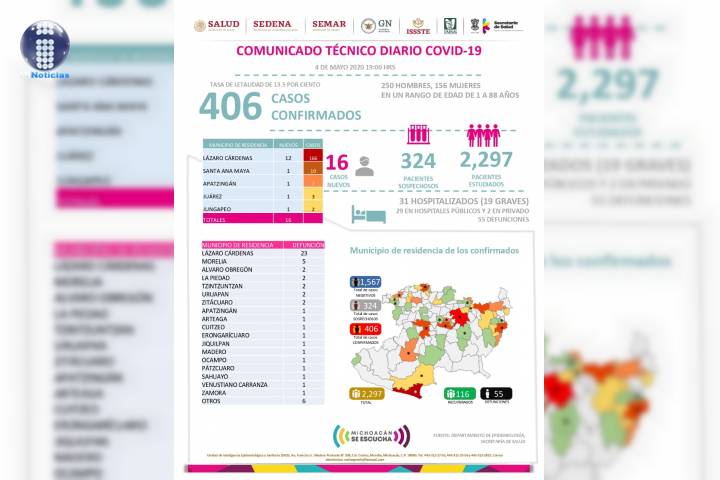 NOTICIAS 04/05/2020Michoacán, con 55 defunciones por COVID-19En la UIES ESTATAL, se han recibido un total de 2 mil 279 notificaciones de enfermos de vías respiratorias, a descartar coronavirus, 1 mil 567 cumplieron con definición operacional resultando negativas a COVID-19, es decir, no tienen el virus.