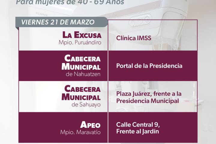 NOTICIAS 15/03/2025A estos municipios llevará SSM mastografías gratuitas del 18 al 21 de marzoLa Secretaría de Salud de Michoacán (SSM) invita a mujeres de 40 a 69 años de los municipios de Puruándiro, Cherán, Sahuayo, Queréndaro, Maravatío y Nahuatzen a ubicar la unidad móvil de mastografía más cercana a su comunidad, para que se realicen este estudio gratuito que ayuda a detectar el cáncer de mama.