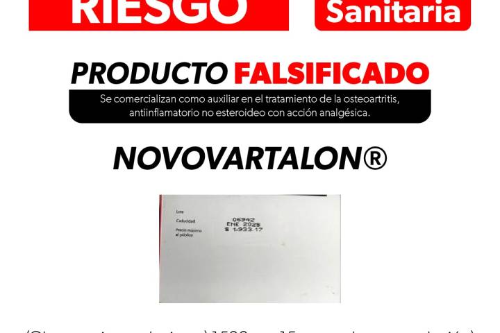 NOTICIAS 20/03/2025Alerta sobre falsificación del producto Novovartalon: SSM La Comisión Federal para la Protección contra Riesgos Sanitarios (COFEPRIS), a través de la Secretaría de Salud de Michoacán (SSM), ha emitido una actualización de su aviso de riesgo con fecha 07 de febrero de 2025, referente a la identificación y comercialización del producto falsificado NOVOVARTALON® 1500 mg-15 mg (glucosamina-meloxicam), polvo para solución.