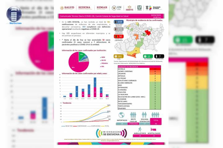 NOTICIAS 10/04/2020 50 casos confirmados de COVID-19 en la entidadEn la UIES ESTATAL, se han recibido un total de 581 notificaciones de enfermos de vías respiratorias, a descartar coronavirus, 359 cumplieron con definición operacional resultando negativas a COVID-19.