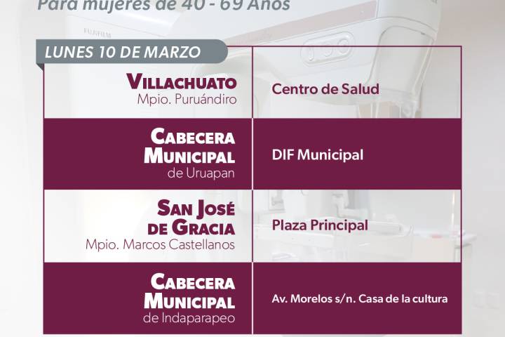 NOTICIAS 09/03/2025SSM llevará mastografía gratuitas a 8 municipios A partir del lunes 10 de marzo, unidades móviles de mastografía de la Secretaría de Salud de Michoacán (SSM), recorrerán 8 municipios de la entidad, con el fin de realizar estudios gratuitos de mama a mujeres de 40 a 69 años de comunidades alejadas.