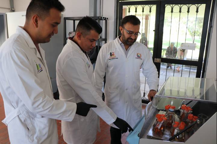Christian Salto Reyes e Israel Aguilar Hernández, de noveno y octavo semestre de Ingeniería Bioquímica, quienes son asesorados por los maestros en Ciencias Biológicas, Humberto ... Ver más...