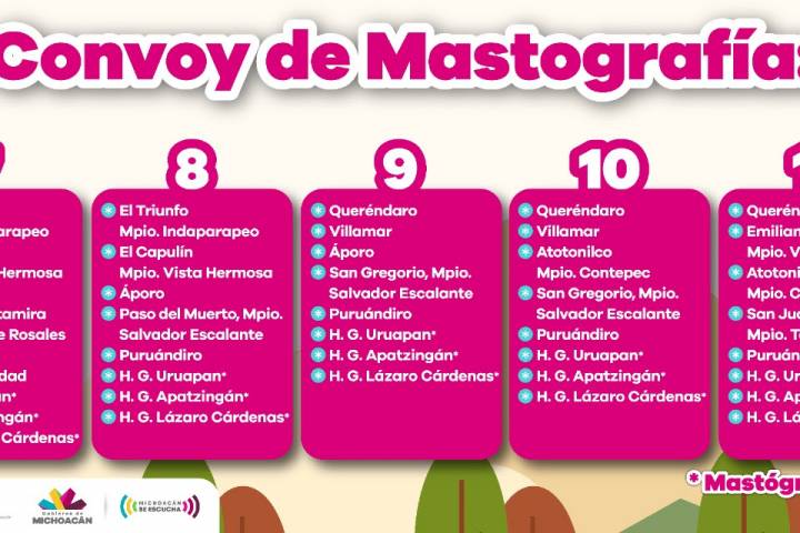 NOTICIAS 04/10/2019Invita SSM a michoacanas para que acudan a convoyes de mastografía La Secretaría de Salud de Michoacán (SSM) acerca los servicios de detección oportuna de cáncer de mama a las michoacanas, a través de los Convoyes de Mastografía, los cuales estarán del 7 al 11 de octubre en los siguientes lugares: