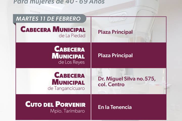 NOTICIAS 09/02/2025Anuncia SSM mastografías gratis en cuatro municipios Las unidades móviles de mastografía de la Secretaría de Salud de Michoacán, recorrerán 4 municipios del 10 al 14 de febrero, para otorgar estudios gratuitos a mujeres michoacanas y detectar oportunamente el cáncer de mama.