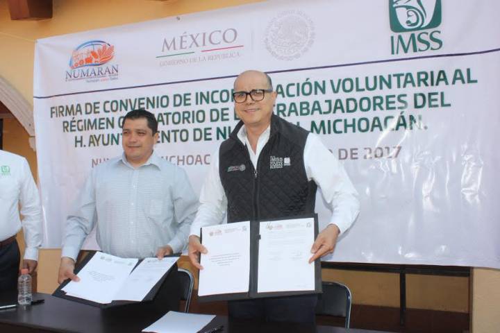 Con la firma del Convenio de Incorporación Voluntaria al Régimen Obligatorio de los Trabajadores del Honorable Ayuntamiento de Numarán, 27 trabajadores de seguridad pública del municipio de Numaran serán incorporados al régimen obligatorio del IMSS.