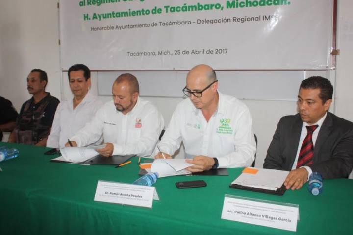 Tras la firma de un Convenio de Incorporación Voluntaria al Régimen Obligatorio de los Trabajadores del Ayuntamiento de Tacámbaro, Michoacán y el Instituto Mexicano del Seguro Social (IMSS) Delegación Michoacán, en su primer etapa 150 trabajadores del área de seguridad pública, tránsito municipal y protección civil, contarán con seguridad social.