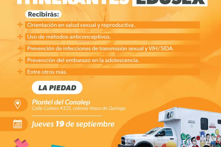 NOTICIAS 18/09/2024SSM acercará servicios de salud sexual y reproductiva a estudiantes de La PiedadEl jueves 19 de septiembre, la Secretaría de Salud de Michoacán (SSM) llevará su unidad móvil Edusex a escuelas de La Piedad, para ofrecer orientación, consejería y métodos anticonceptivos a estudiantes, para prevenir infecciones de transmisión sexual y embarazos no planificados.