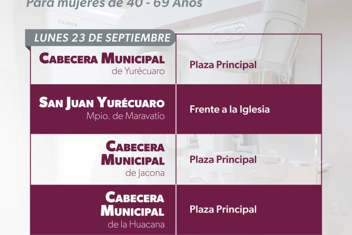 Los días lunes 23 y martes 24, las unidades móviles de mastografía estarán en las plazas principales de Yurécuaro, Jacona y La Huacana; mientras que en Maravatío será frent... Ver más...