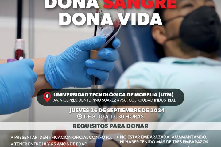NOTICIAS 24/09/2024Invita SSM a participar en la colecta de sangre de la UTM La Secretaría de Salud de Michoacán (SSM) invita a estudiantes, docentes, personal de la Universidad Tecnológica de Morelia (UTM) y población abierta a participar en la colecta de sangre que realizará el jueves 26 de septiembre.