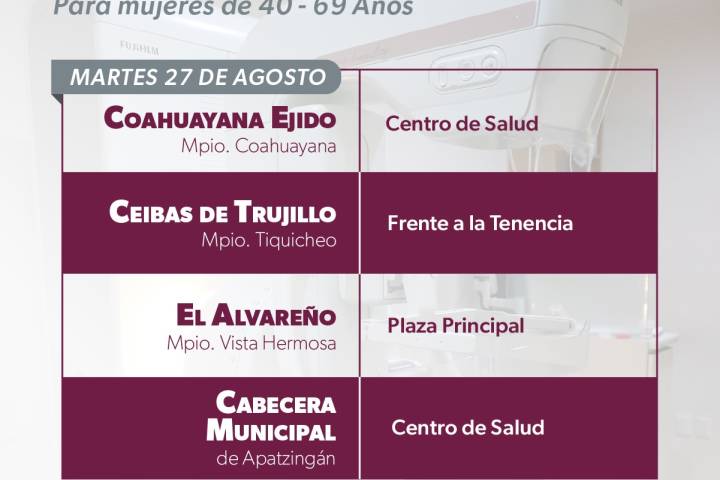 NOTICIAS 25/08/2024Mostografías gratuitas a mujeres de 7 municipios: SSM Del 26 al 30 de agosto las cuatro unidades móviles de mastografía de la Secretaría de Salud de Michoacán (SSM) visitarán siete municipios para realizar estudios de mama gratuitos a mujeres de 40 a 69 años de edad.