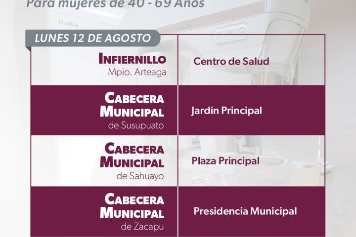NOTICIAS 13/08/2024SSM llevará mastografías en unidades móviles a 9 municipios de MichoacánDel 13 al 16 de agosto, la Secretaría de Salud de Michoacán (SSM) llevará mastografías gratuitas, a través de unidades móviles, a nueve municipios de la entidad, en aras de detectar oportunamente el cáncer de mama, a todas las mujeres, a partir de los 40 años de edad.