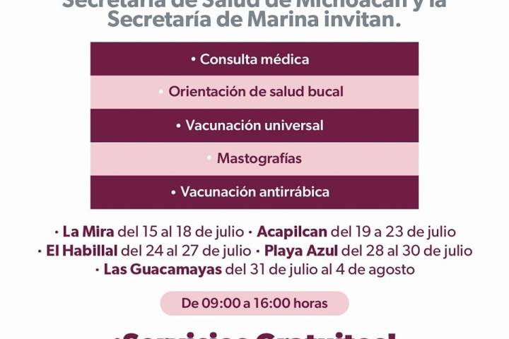 Del 24 al 27 de julio, las secretarías de Salud de Michoacán (SSM) y de Marina (Semar) invitan a la feria de la salud, en la tenencia El Habillal, de Lázaro Cárdenas, donde ofrecerá consultas médicas gratuitas, dentales y de nutrición, estudios de laboratorio y medicamentos a la población abierta.
