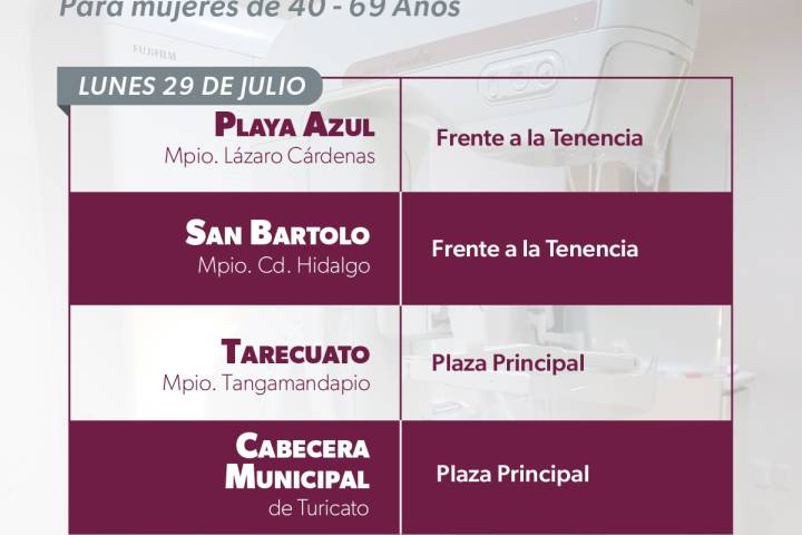 NOTICIAS 26/07/2024Realizará SSM mastografías gratuitas en 7 municipios Del 29 julio al 2 de agosto, todas las mujeres de 40 a 69 años de los municipios de Lázaro Cárdenas, Hidalgo, Tangamandapio, Turicato, Tacámbaro, Chavinda y Coeneo, podrán solicitar una mastografía gratuita en las jornadas que realizará la Secretaría de Salud de Michoacán (SSM).