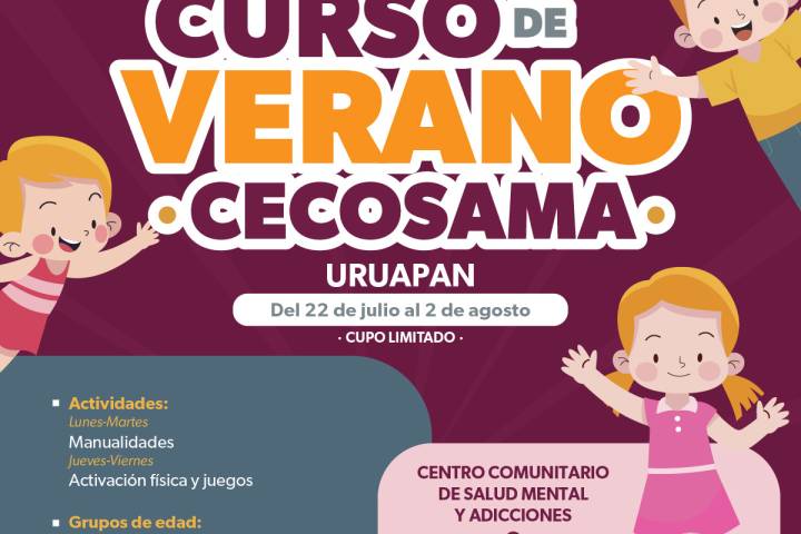 NOTICIAS 18/07/2024SSM tendrá curso de verano en Uruapan para prevenir adicciones En estas vacaciones de verano donde las familias buscan cursos intensivos para sus hijos, la Secretaría de Salud de Michoacán (SSM) ofrece el curso de verano en el Centro Comunitario de Salud Mental y Adicciones (Cecosama) de Uruapan, en donde niños y niñas de nueve a 13 años aprenderán a utilizar el dibujo, la pintura, el origami y dinámicas divertidas para la prevención en el uso de sustancias nocivas como alcohol y tabaco.