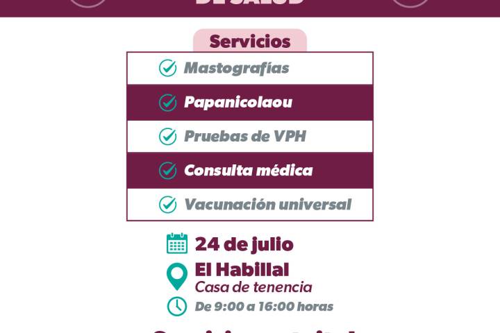 NOTICIAS 19/07/2024Realizará SSM mastografías y pruebas gratuitas de Papanicolaou en LCTodas las mujeres de la tenencia de El Habillal, en el municipio de Lázaro Cárdenas, podrán solicitar de manera gratuita el martes 24 de julio mastografías, pruebas de Papanicolaou y del Virus de Papiloma Humano (VPH), en la cancha ubicada a un costado de la casa de tenencia.