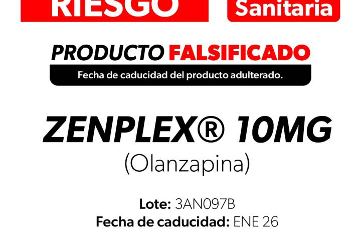 NOTICIAS 20/01/2026SSM alerta a la población sobre medicamento adulterado Zenplex (Olanzapina)La Comisión Federal para la Protección contra Riesgos Sanitarios (Cofepris), a través de la Secretaría de Salud de Michoacán (SSM), informa a la población sobre un aviso de riesgo sanitario relacionado con el medicamento Zenplex®️ (Olanzapina), en presentación de tabletas de 10 mg, correspondiente al lote 3AN097B.