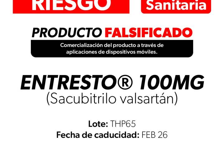 NOTICIAS 21/01/2026SSM alerta a la población sobre medicamento falsificado EntrestoLa Comisión Federal para la Protección contra Riesgos Sanitarios (Cofepris), a través de la Secretaría de Salud de Michoacán (SSM), informa a la población sobre la detección de la falsificación del medicamento Entresto®️ (Sacubitrilo valsartán), en su presentación de caja con 60 comprimidos de 100 mg, fármaco recetado para tratar la insuficiencia cardíaca.