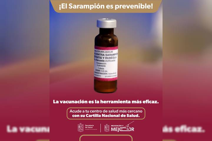 NOTICIAS 22/01/2026SSM llama a vacunarse contra el sarampión en los centros de salud del estado La Secretaría de Salud de Michoacán (SSM) enfatiza que la inmunización sigue siendo la herramienta más eficaz y segura para prevenir el sarampión, ya que más del 90 por ciento de los casos confirmados corresponden a personas sin antecedente de vacunas.