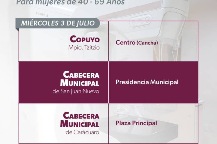 NOTICIAS 01/07/2024SSM realiza mastografías gratuitas en 7 municipios de MichoacánLa Secretaría de Salud de Michoacán (SSM) invita a todas las mujeres entre 40 y 69 años a realizarse una mastografía gratuita durante la primera semana de julio, a fin de detectar a tiempo el cáncer de mama, una de las principales causas de muerte entre las mujeres mexicanas.