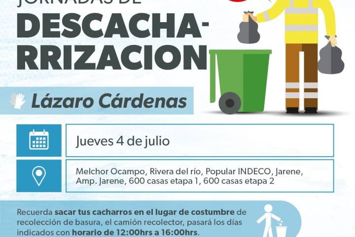 NOTICIAS 02/07/2024Recolectará SSM cacharros en 20 colonias de Lázaro CárdenasDel 2 al 5 de julio, la Secretaría de Salud de Michoacán (SSM) recolectará gratuitamente cacharros como llantas, botellas, cubetas, tinas de plástico y muebles en desuso en 20 colonias de Lázaro Cárdenas, para prevenir el dengue, zika y chikungunya.
