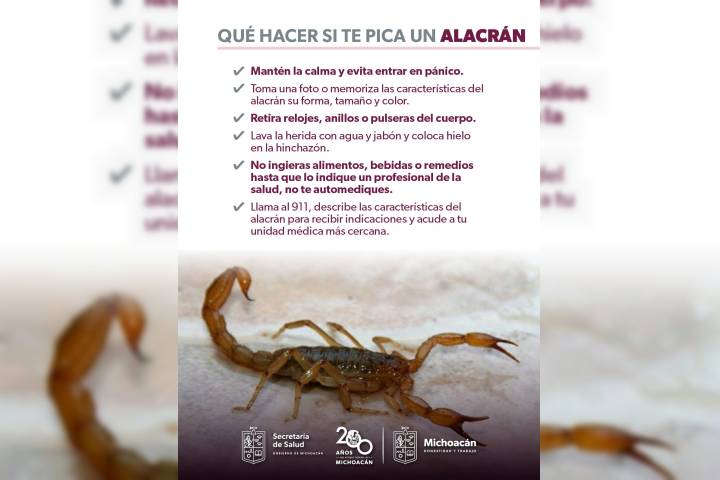 NOTICIAS 05/06/2024¿Sabes qué hacer en caso de picadura de alacrán? La SSM te explica La temporada de calor favorece la proliferación de alacranes, arácnidos venenosos cuya picadura requiere atención médica inmediata. Por ello, la Secretaría de Salud de Michoacán (SSM) informa sobre qué hacer ante esta emergencia.