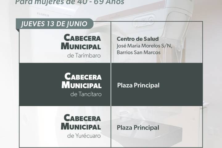 NOTICIAS 07/06/2024Realizará SSM mastografías gratuitas en 5 municipios de MichoacánLa Secretaría de Salud de Michoacán (SSM) realizará la próxima semana mastografías gratuitas en los municipios de Copándaro, Tarímbaro, Tancítaro, Tanhuato y Yurécuaro, como parte de la campaña de detección oportuna de cáncer de mama.