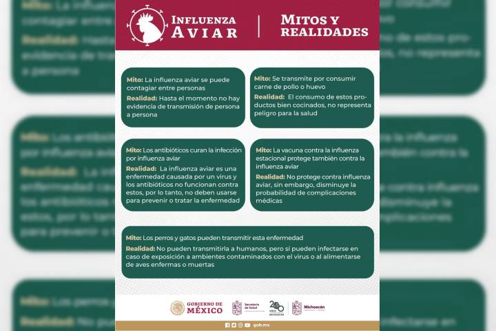 NOTICIAS 07/06/2024Conoce los mitos y realidades de la gripe aviarLa gripe aviar, también conocida como influenza aviar, es una enfermedad infecciosa que afecta principalmente a las aves y se transmite con mayor frecuencia con el contacto con las secreciones respiratorias o las heces de aves infectadas; es por ello que la Secretaría de Salud de Michoacán (SSM) explica los mitos y realidades de este virus.