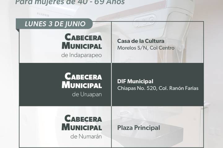 NOTICIAS 31/05/2024SSM anuncia mastografías gratuitas en 6 municipiosTodas las mujeres asentadas en Indaparapeo, Chucándiro, Uruapan, Copándaro, Numarán y La Piedad, podrán solicitar una mastografía gratuita del 3 al 7 de junio, pues la Secretaría de Salud de Michoacán (SSM) llevará hasta los seis municipios sus mastógrafos móviles.