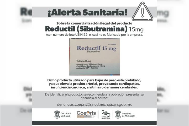 NOTICIAS 13/05/2024Alerta Cofepris sobre venta ilegal de producto antiobesidad La Comisión Federal para la Protección contra Riesgos Sanitarios (Cofepris), a través de la Secretaría de Salud de Michoacán (SSM), alerta a la población sobre la comercialización ilegal del producto "Reductil" (sibutramina) de 15 miligramos y con número de lote UZINI52, ya que es falsificado.