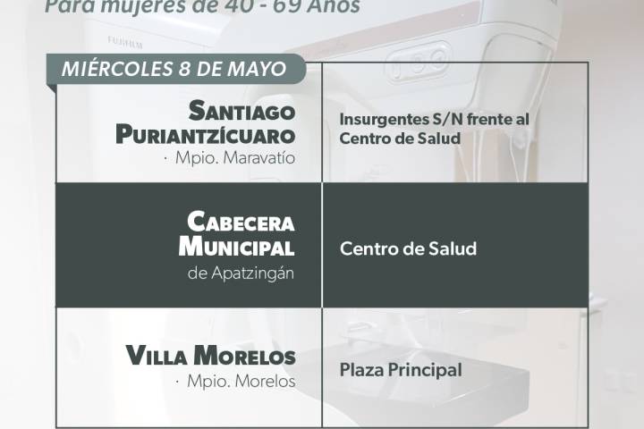 NOTICIAS 03/05/2024Anuncia SSM mastografías gratuitas en 4 municipios de Michoacán Para detectar y tratar a tiempo nuevos casos de cáncer de mama, cuando la esperanza de vida es mayor, la Secretaría de Salud de Michoacán (SSM) realizará mastografías gratuitas a las mujeres de 40 a 69 años de los municipios de Apatzingán, Maravatío, Morelos y Puruándiro.
