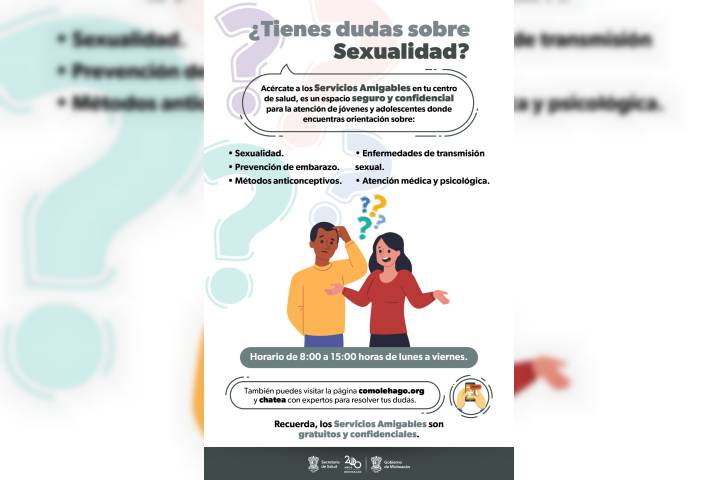 NOTICIAS 05/05/2024Mantener una salud sexual y reproductiva sin riesgos, objetivo de los Servicios Amigables: SSMLa Secretaría de Salud de Michoacán (SSM), cuenta con personal capacitado, empático y sensibilizado en sus 182 módulos de servicios amigables, donde se brinda a las y los jóvenes atención relacionada a temas de la salud sexual y reproductiva.