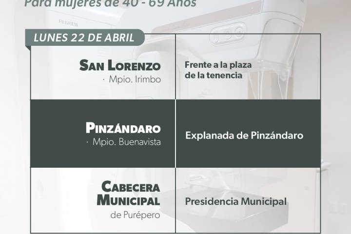 El lunes 22 de abril las unidades móviles de mastografía estarán en afuera de la presidencia municipal de Purépero; la explanada de Pizándaro, municipio de Buenavista; y frente a la plaza principal de la tene... Ver más...