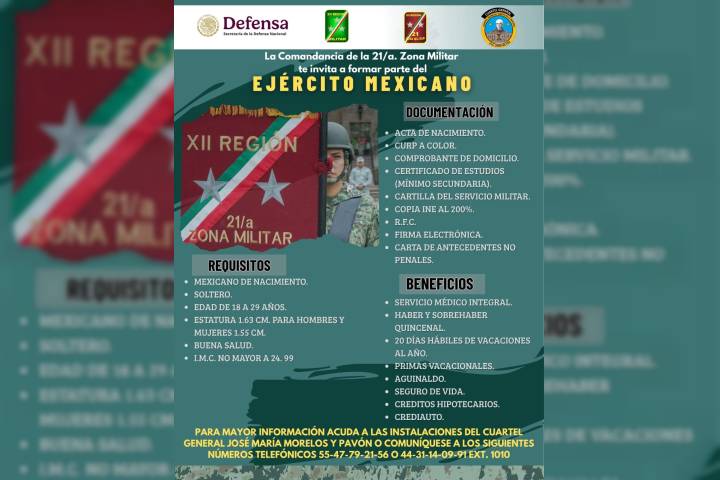 NOTICIAS 21/03/2026La 21/a. Zona Militar invita a mujeres y hombres a formar parte del Ejército MexicanoLa Comandancia de la 21/a. Zona Militar hace una invitación a todas las mujeres y hombres entre 18 y 29 años de edad, interesados en formar parte del Ejército Mexicano.